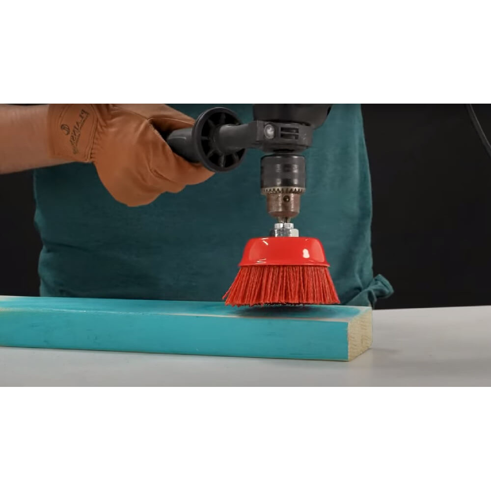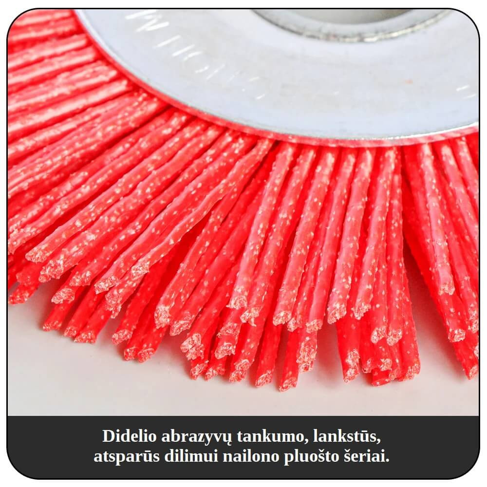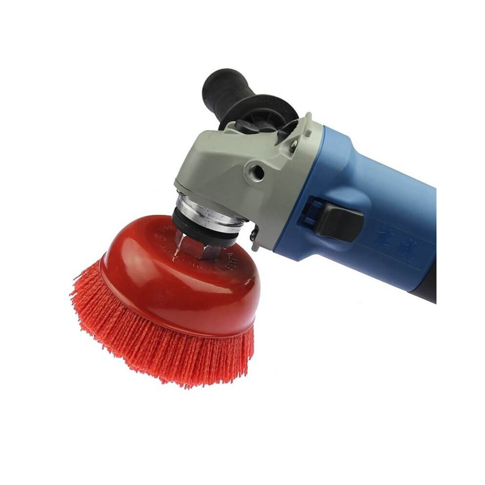 Nailoninis, kūginis šveitimo šepetys kampiniam šlifuokliui M14 sriegiu, 75 mm diametro. Skirtas – dažytų, lakuotų, metalų, medienos, keramikos, akmens gaminių valymui, rūdžių šalinimui, paviršių šiurkštinimui. Abrazyviniai šeriai atsparūs didelėms apkrovoms, pasižymi mažu trinties koeficientu ir geromis mechaninėmis, elektroizoliacinėmis savybėmis, atsparūs tepalams, druskoms, žibalui, silpnoms rūgštims ir šarmams, tačiau – absorbuoja drėgmę.